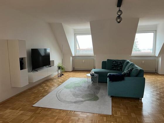 Die geräumige Dachgeschosswohnung wird mit neuwertigen und modernen Möbeln vermietet. Neben einem Schlafzimmer gibt es ein Gästezimmer, ein Büro und ein geräumiges Wohnzimmer mit Essbereich. Die Küche ist voll ausgestattet...