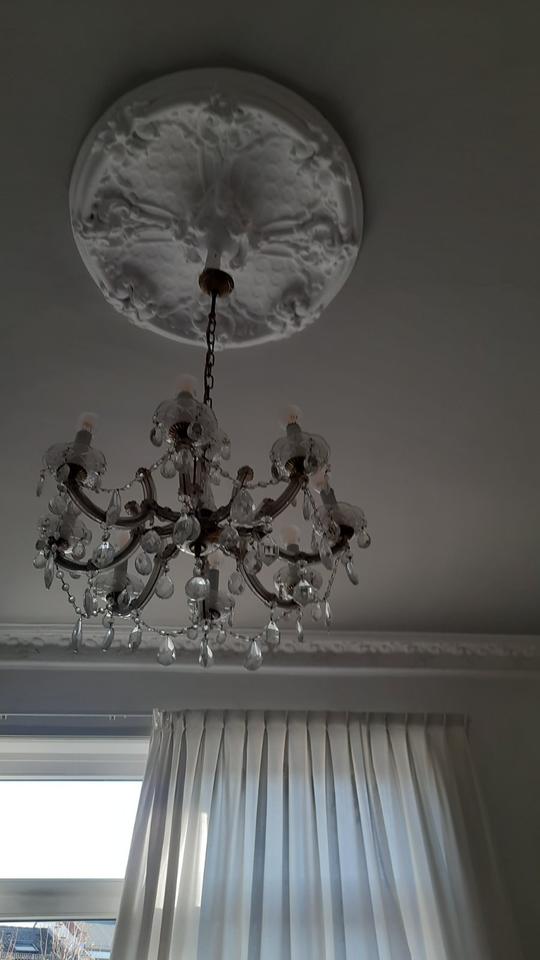 großzügige, herrschaftliche Wohnung mit Stuck und vielen Einbauregalen, Bett, Tisch, Sofa, Kronleuchter, Vorhängen,