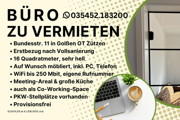 Wir vermieten ein sehr schönes und helles Büro mit ca. 15–16 m² (Grundfläche ca. 4 × 4 m). Optional kann ein zweites Büro gleicher Größe angemietet werden.