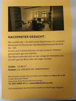 Ab 1.10.2025 steht in der Berliner Vorstadt in Potsdam zur Nachmietung ein Kellerraum zur Verfügung. Besichtigung unter 0331 2009840 möglich.