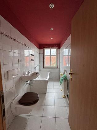 Das Bad ist mit einer Badewanne und einem Fenster ausgestattet.