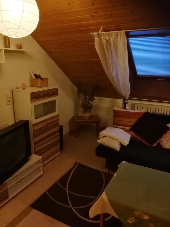 # Objektbeschreibung Dachgeschoss-Appartement auf zwei Ebenen, offene Wohnweise, voll möbliert W-LAN - gute Anbindung an öffentliche Verkehrsmittel, sowohl Einkaufsmöglichkeit zu Fuß. Nur geeignet an Wochenendheimfahrer.