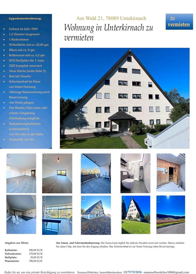 Kaltmiete 500,00 Euro Stellplatz 30,00 Euro Vorauszahlung 170,00 Euro Warmmiete 700,00 Euro Kaution 1.060,00 Euro