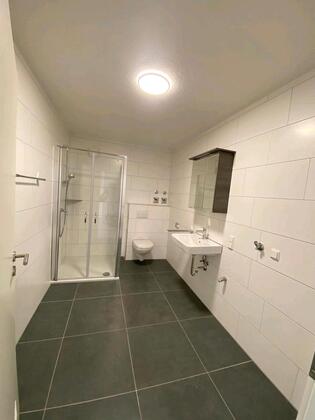 Neues Bad mit Dusche, Waschbecken, WC und Waschmaschinenstellplatz