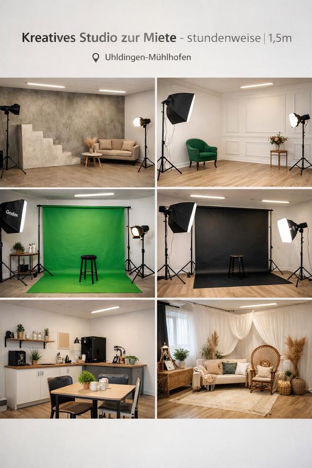 Beschreibung: Modernes Creative Studio in Uhldingen-Mühlhofen zur stundenweisen Miete – ideal für Foto- & Video-Shootings, Content Creation, Geburtstags- oder Eventfotos.