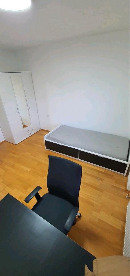 Bett, Kleiderschrank, Schreibtisch, schreibstuhl sind vorhanden.