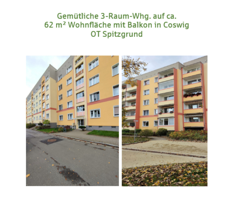 Die zur Vermietung stehende geräumige 3-Raum-Wohnung befindet sich im 3. Obergeschoss eines Mehrfamilienhauses in Coswig im Ortsteil Spitzgrund. Die Wohnfläche beträgt ca. 62 m².