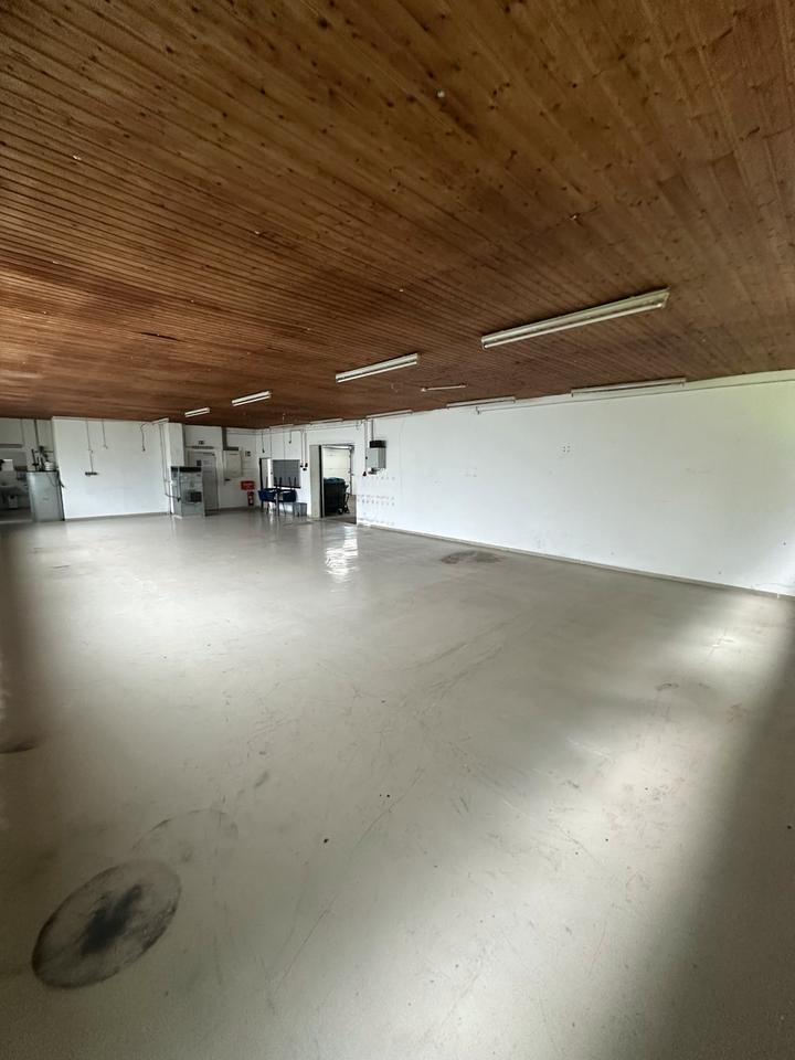 die Halle ist ca 350m2 groß und beheizbar mit einer Ölheizung und alternativ kann man auch einen Kaminofen reinstellen.