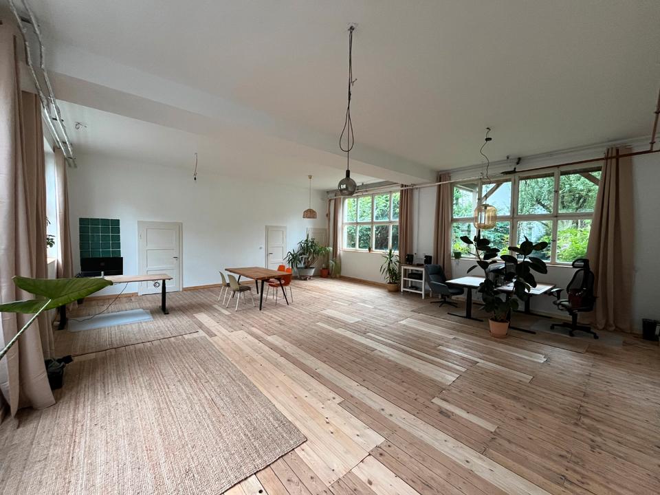 Mehr zum Angebot Großes Loftbüro mit Küche & Bar, Garten – flexible kreative Räume: