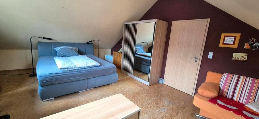 Wir bieten ein schönes großes Zimmer mit Doppel-Boxspringbett, Schlafcouch, Schrank, Kommode, Schreibtisch, Kühlschrank mit Gefrierfach, Kaffeemaschine,...