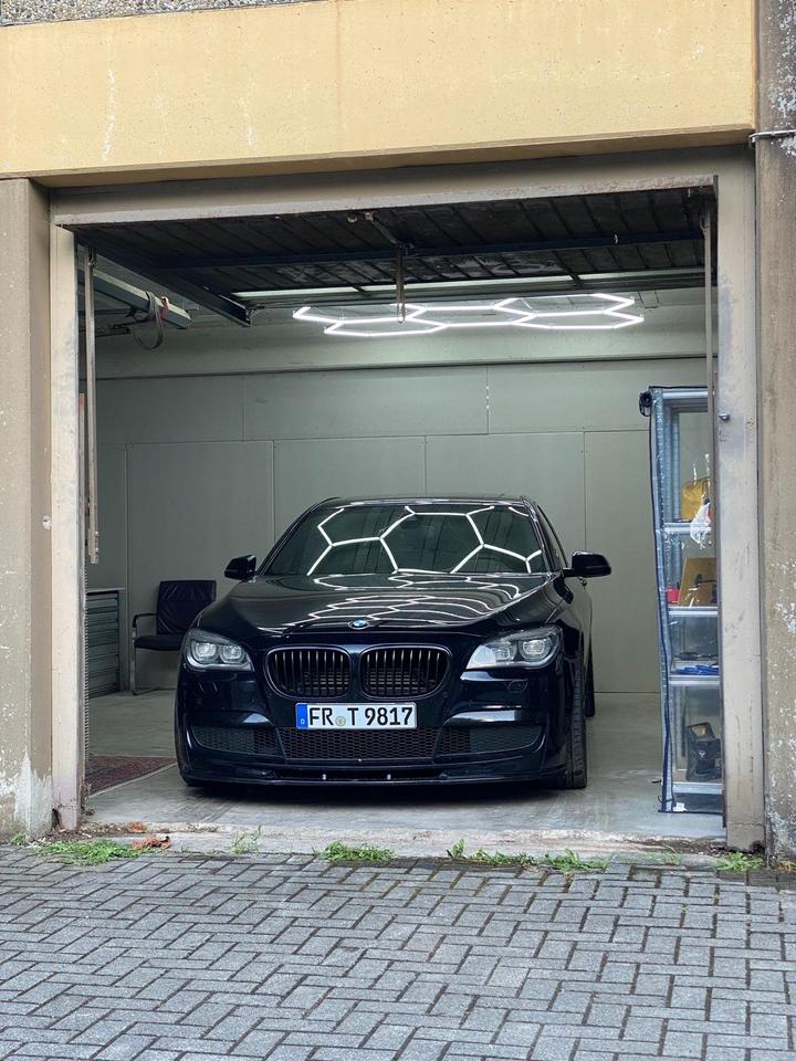 Helle geschlossene Doppelgarage mit zwei Toren inklusive LED Wabenlicht und Werkbank.