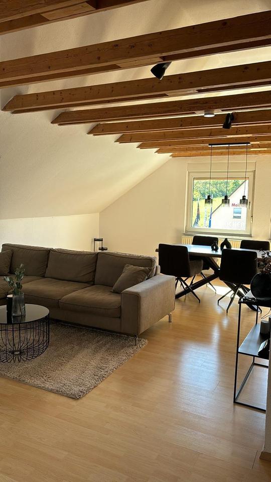 Die geräumige Wohnung ist in einem 3-Familienhaus im Dachgeschoss. Neben einem großzügigen Wohn-Essbereich (Einbauküche) mit Sichtbalken im offenen Giebel gibt es zwei Schlafzimmer und ein Badezimmer mit Dusche.