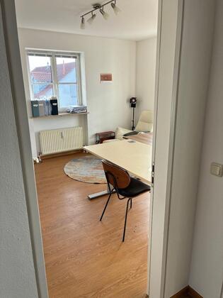 Moderner Büroraum mit Balkon zum Garten in sympathischer Bürogemeinschaft (3 Parteien). Sehr ruhiger Raum zum Hof mit jeder Menge Tageslicht. Ideal für 1-2 Personen.