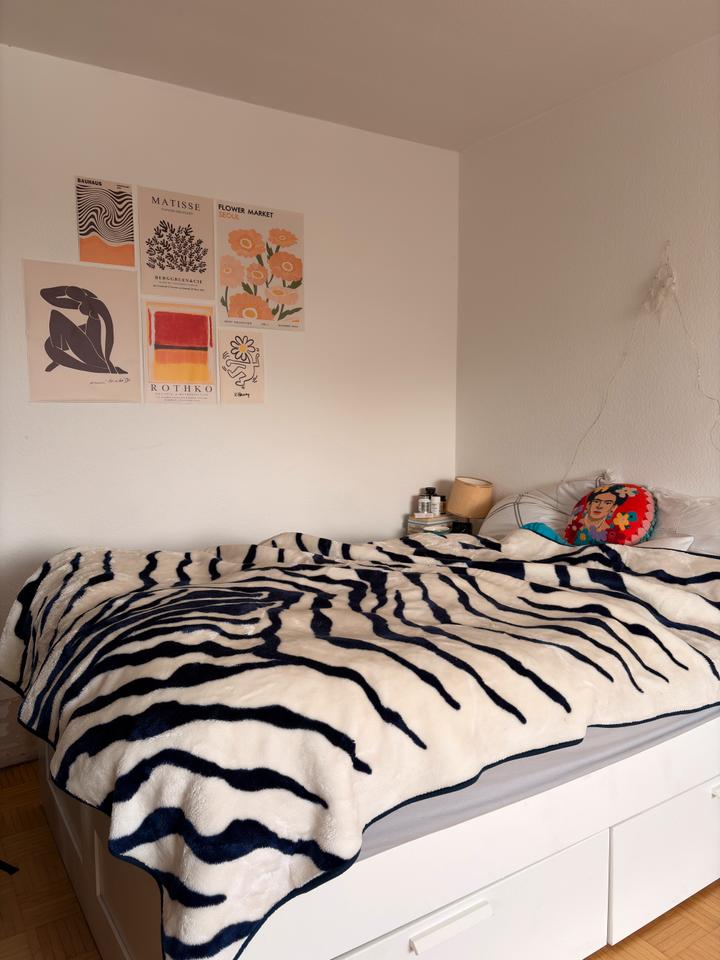 Das Zimmer ist rechteckig geschnitten und hat zwei große Fenster, eins davon ein französischer Balkon. Beide lassen super viel Licht rein. Das Zimmer wird mit den Möbeln Vermietet. Ansonsten ist die...