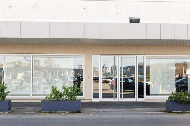 Das Geschäft ist ebenerdig über eine große Eingangstüre erreichbar. Links und rechts davon gibt es Schaufensterflächen.