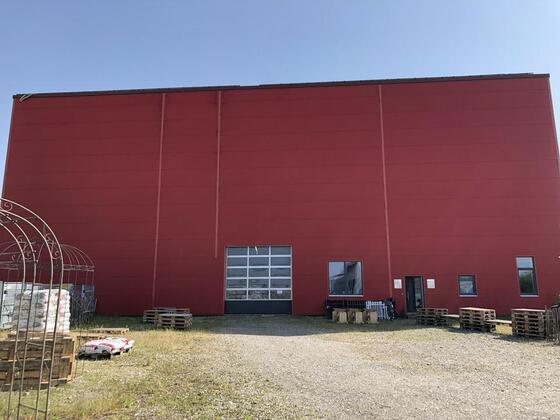 # Objektbeschreibung Hohe, gedämmte Gewerbe-/ Lagerhalle mit 14 m Höhe und großer Aussenfläche - ebenerdige Zufahrt mit Sektionaltor - Pultdach Höhe: 14 m auslaufend auf 5 m - Sektionaltor: ca. 400 x 400 cm -...