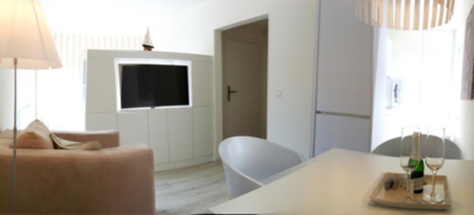 Die Wohnung "Sand" ist modern, hell und als offener Wohn-Schlafraum konzipiert. Eine offene, neuwertige Küchenzeile ist zum Essplatz orientiert. Garderobe und Einbauschränke bieten eleganten Stauraum. Ein Einbaumöbel mit integriertem und drehbarem Fernseher dient als Raumteiler. Das...