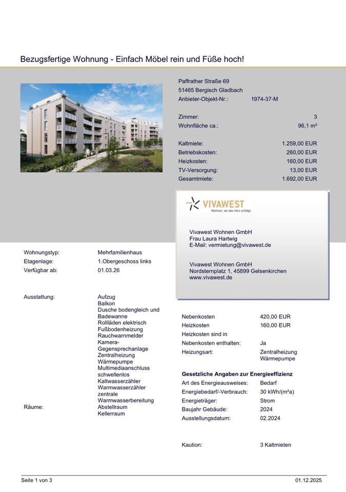 Wir suchen einen Nachmieter für unsere moderne und bezugsfertige 3-Zimmer-Wohnung in Bergisch Gladbach. Die Wohnung liegt im 1. Obergeschoss eines Neubaus (Baujahr 2024) und bietet eine hochwertige Ausstattung in ruhiger Wohnlage.