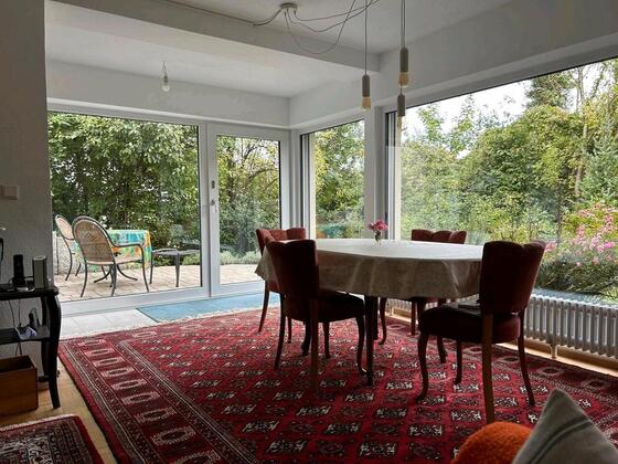 Wir vermieten temporär ab 14.06. eine Vintage-möblierte Einliegerwohnung (energetisch auf neuestem Stand) mit Schlafsofa ( 1,60 m), Panorama Fenster und Terrasse mit Blick in den Garten und Wald, Einbauküche, Bad...