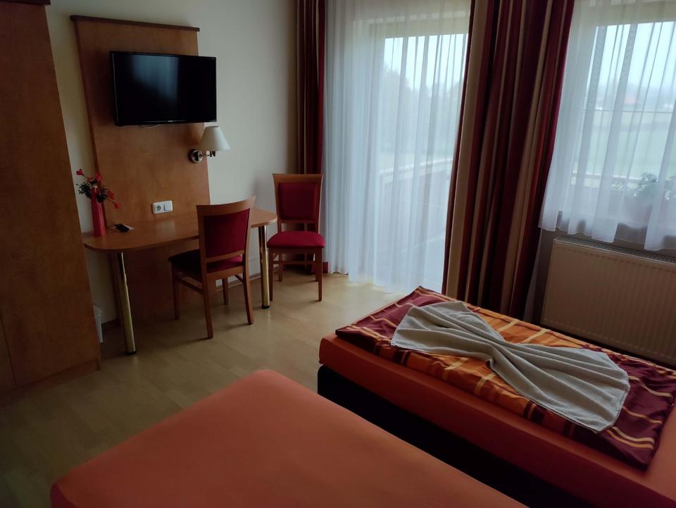 Es erwartet Sie ein schönes helles Zimmer mit Balkon. Ausgestattet mit frisch bezogenem Bett, Nachtkästchen, Schrank mit Spiegel, Garderobe, Sat TV und eigenem Bad mit Waschtisch, Dusche und WC. Kostenloses...