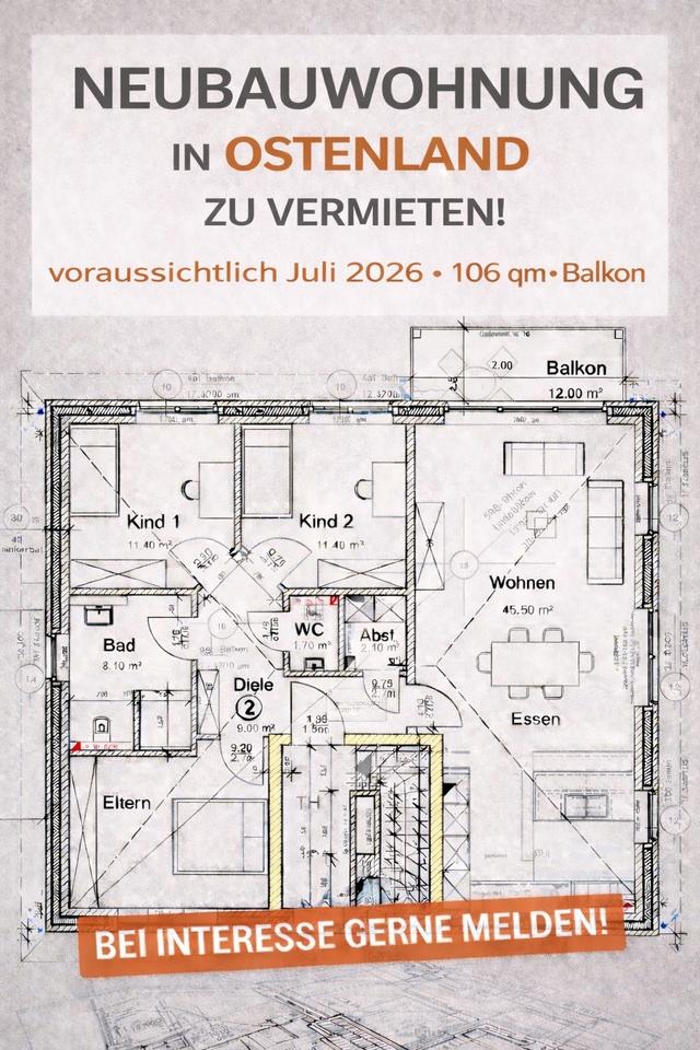 Zur Vermietung steht eine moderne Neubauwohnung in Ostenland, verfügbar ab voraussichtlich Juli 2026.