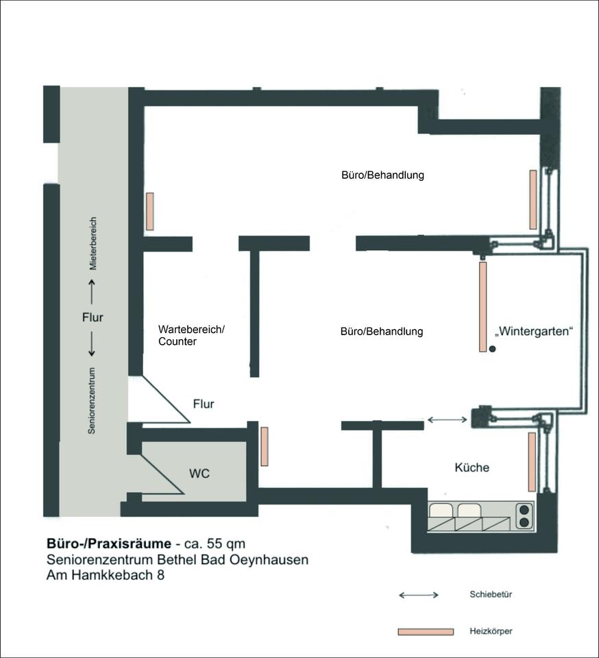 Gut geschnittene Büro-/Praxisräume zu vermieten Ca. 55 qm in Bad Oeynhausen, Nahe HDZ Im Erdgeschoss einer des Mietkomplexes des Seniorenzentrum Bethel Bad Oeynhausen, mit...