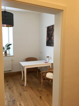 Ausstattung: Eichendielenboden, Liege (falls gewünscht), zwei Korbstühle, ein kleiner Schreibtisch...