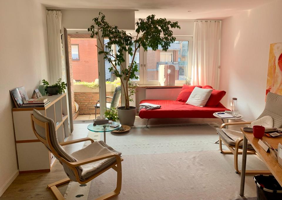 Der Raum ist etwa 20qm groß, hell und freundlich und geeignet für Psychotherapie, Beratung, Coaching.