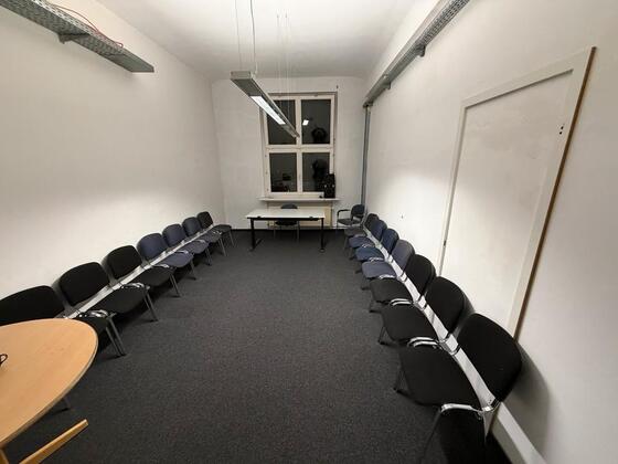 Der Raum ist mit 30 Stapelstühlen und 2 Tischen ausgestattet.