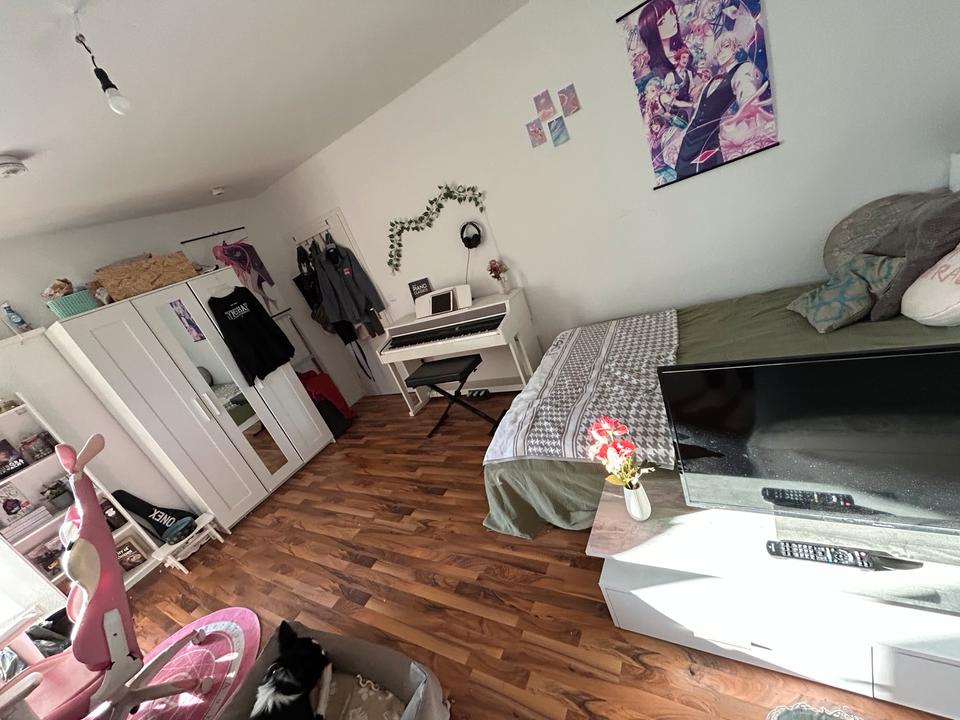 Das Zimmer ist das größte in der Wohnung mit ca 25m2. Durch die großen Fenster, die sehr viel Licht durchlassen, hat man einen sehr schönen und weiten Ausblick. Zudem ist auf der...