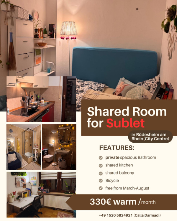 da ich für mein Praktikum in Sommersemester verreise, biete ich mein geliebtes Zimmer zur Untermiete an. Die Wohnung ist perfekt gelegen, um den Sommer in Rüdesheim zu genießen! * Zeitraum: 1....