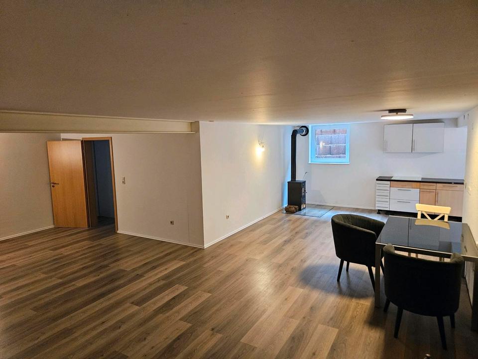 Schöne 2 Zimmer Kellerwohnung in Lahde. Großes offenes Wohnzimmer und Esszimmer mit Küche und Kamin für gemütliche Abende.