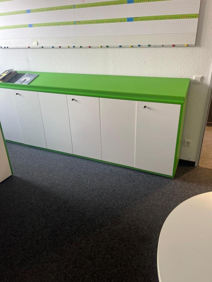 3 Sideboards Büroschränke – weiß & grün verkleidet – mit Ablage