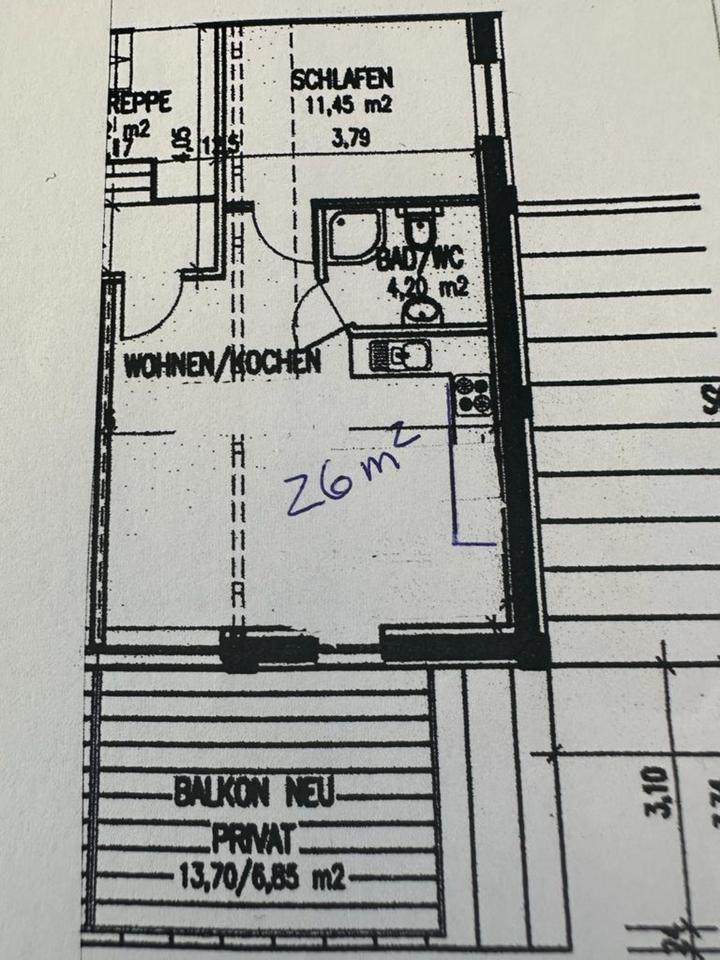 Vermiete ab 01.05.2026 kleine gemütliche Single Wohnung mit riesigen Balkon. Komplett neu renoviert mit neuer Einbauküche. Die Wohnung ist unmöbliert und wird ausschließlich an eine Einzelperson ohne Haustier vermietet. Die Warmmiete beträgt...
