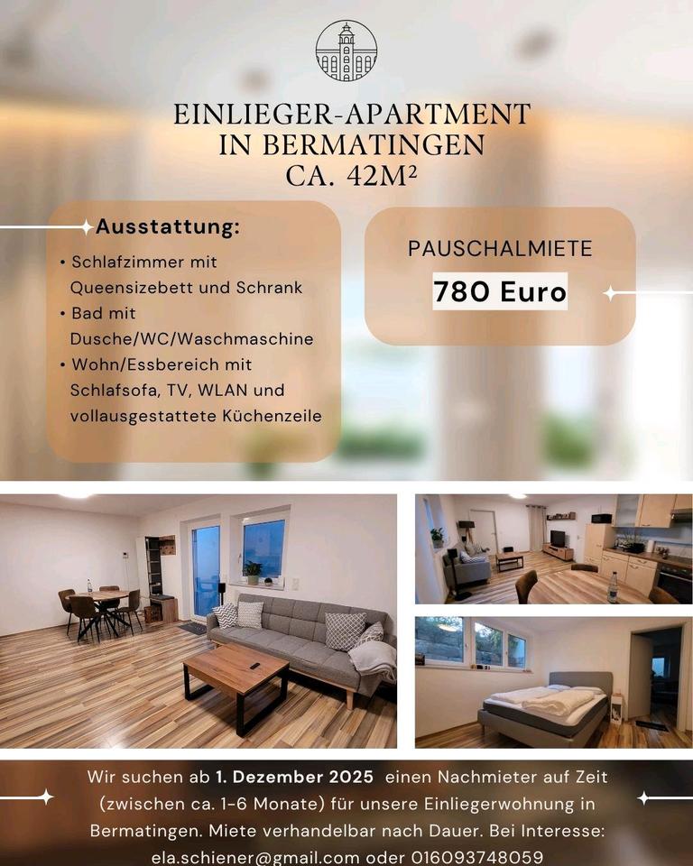 Wir vermieten ab 1. Dezember 2025 unsere Einliegerwohnung auf Zeit in Bermatingen. Die Wohnung ist trotz, dass sie im Keller ist,eine helle Wohnung. Die Wohnung besteht aus folgendem: 2 Zimmer 1 Schlafzimmer mit...