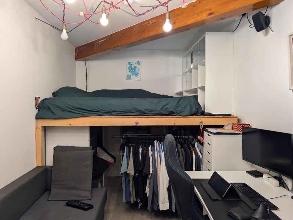 Dein Zimmer hat 12 Quadratmeter. Es geht von der Küche ab. Das Bett ist selbst gebaut und soll drinnen bleiben. Das Zimmer bietet mit dem Hochbett viel Stauraum.