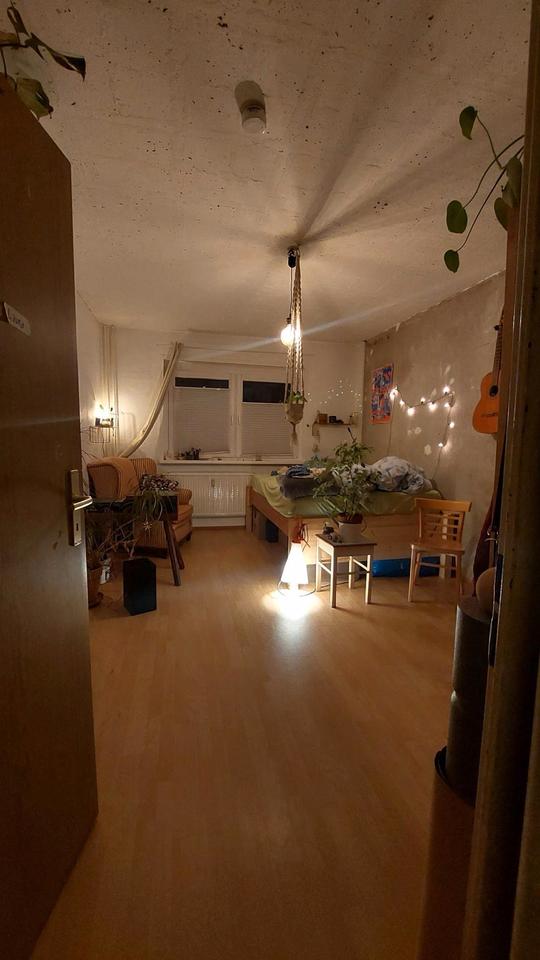 Das Zimmer ist 15 Quadratmeter groß und hat ein gemütliches selbstgebautes Bett. Die zwei Fenster gehen nach Westen raus, leider schluckt das Einkaufszentrum einen Großteil des Lichts. Dafür darf man...