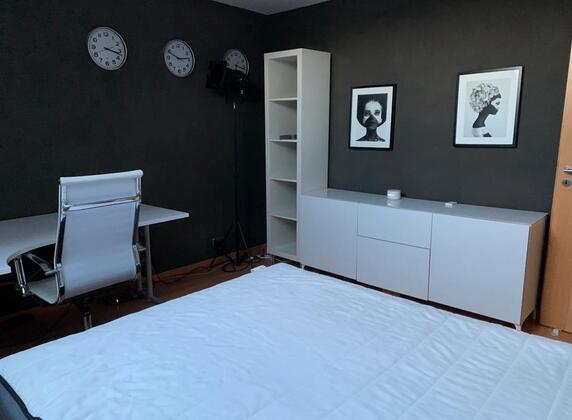 Voll möbliertes Zimmer mit Bett, Regal, Kommode und Schreibtisch . Zimmer befindet sich im unteren Geschoss der Wohnung. Die Gemeinschaftsräume liegen im ebenfalls unteren Geschoss. Das Hauptbad mit Doppelwaschbecken, Dusche...
