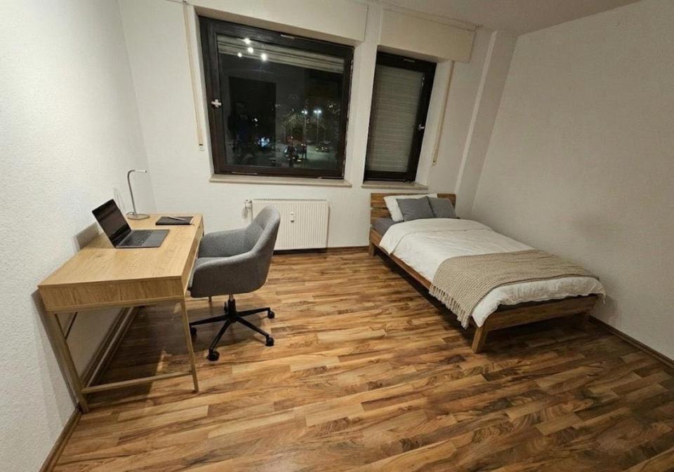 Das Zimmer ist durch die zwei großen Fenster wunderbar hell. Auf den ca. 15 Quadratmetern hast du genug Platz, um dich individuell einzurichten.