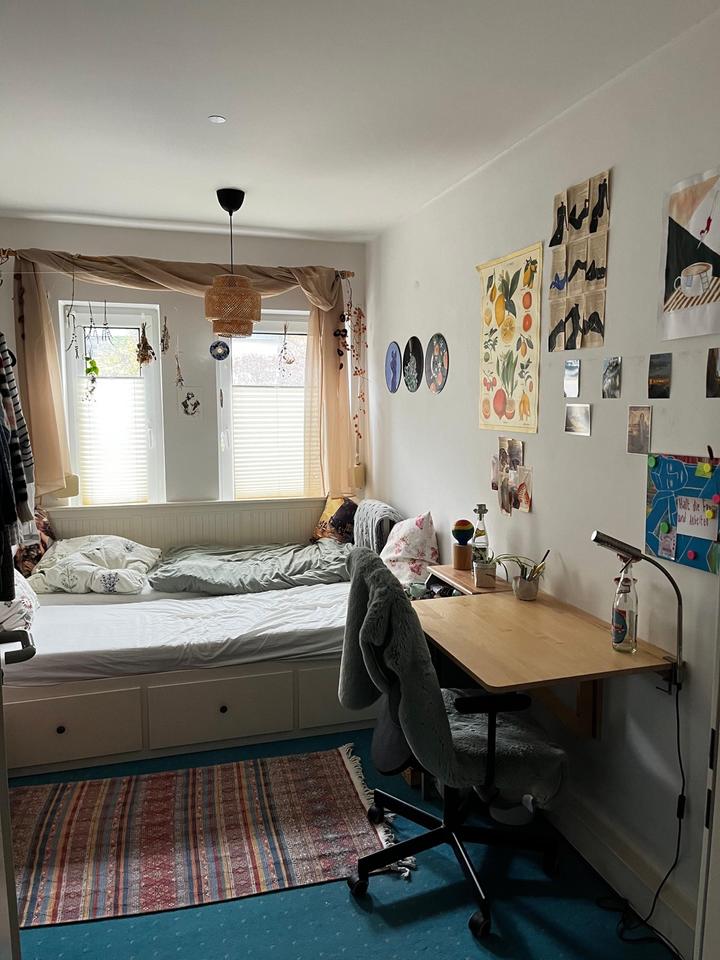 Möbliertes 9 qm Zimmer in einer mausigen dreier WG. In dem Zimmer gibt es ein ausziehbares Bett, einen Schreibtisch, einen großen Kleiderschrank, eine Kleiderstange und Platz für eine Yogamatte :)