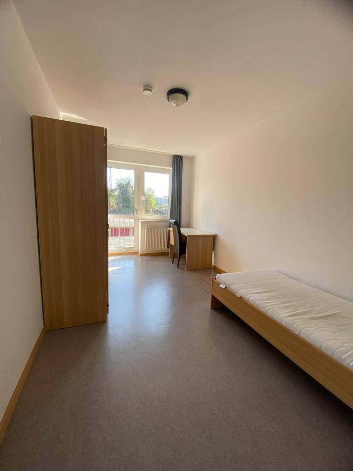 Das Zimmer ist ca. 16 m² groß, liegt im 2. Stock und ist voll möbliert. Zur Ausstattung gehören Bett, Kleiderschrank, Regal, Schreibtisch und Stuhl. Das Zimmer hat zwei große Fenster, die viel...