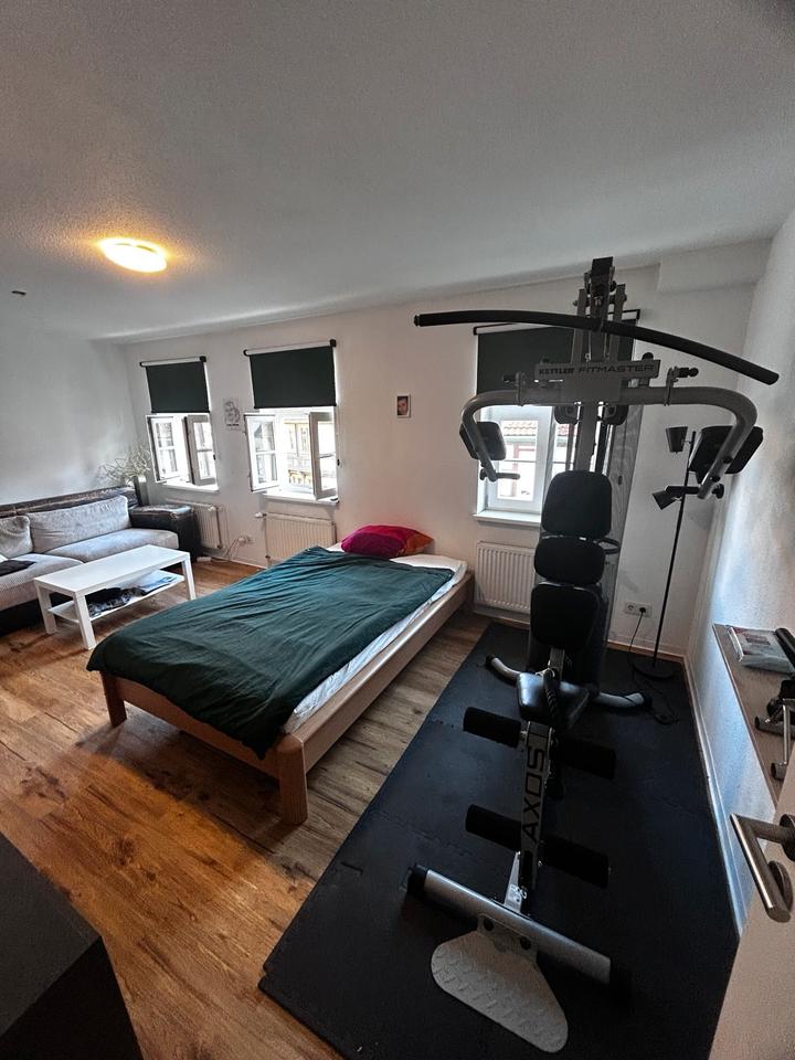 Möbliert mit Bett, Sofa, TV, Sideboard und Fitnessgerät.