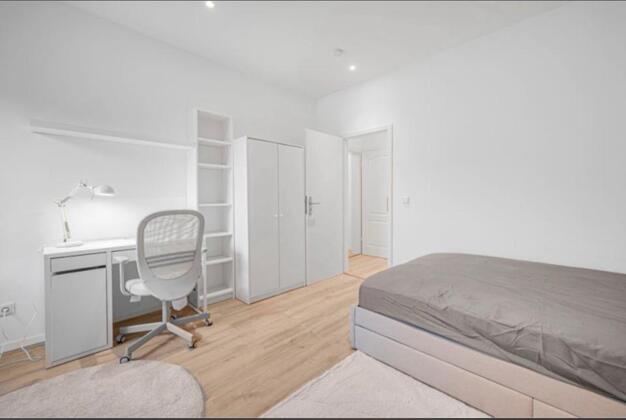 Die freien Zimmer ist ca. 18 m2 groß, hell und voll möbliert: Bett (90x200 cm) inkl. Lattenrost & Matratze, Kleiderschrank, Schreibtisch mit ergonomischem Stuhl, Regal, Nachttisch und Beleuchtung.