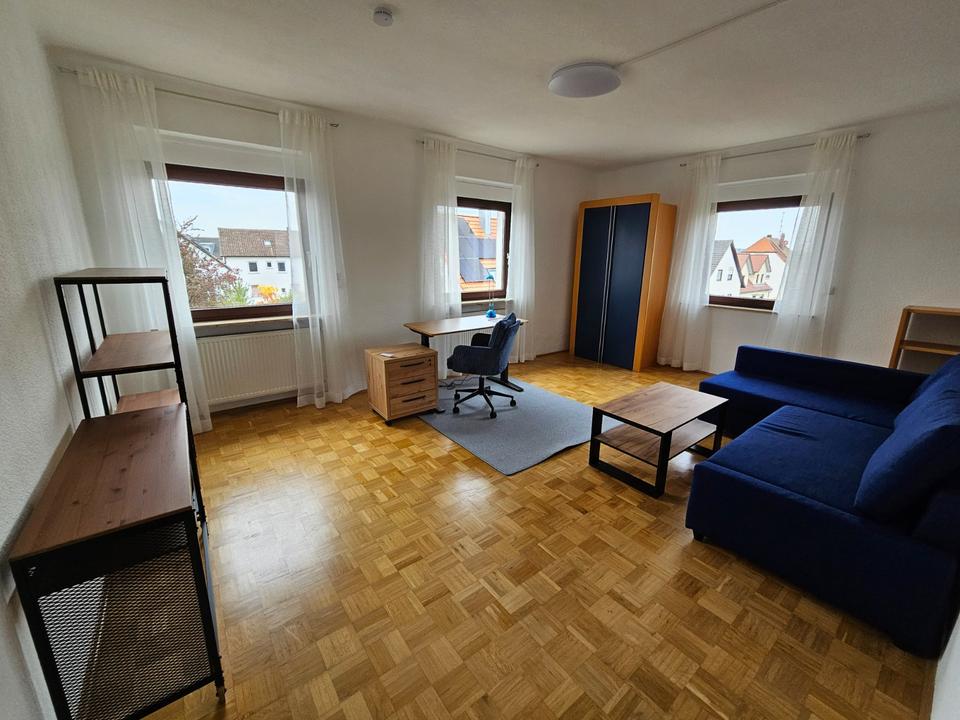 2 helle, freundliche und großzügig geschnittene WG-Zimmer mit je ca. 24 m2. 2025 neu hergerichtet und möbliert: Schrank, Sofabett (mit Bettkasten), Couchtischchen; elektr. höhenverstellbarer Schreibtisch, höhenverstellbarer Schreibtischstuhl, Rollcontainer; Regal, dimmbares Licht...