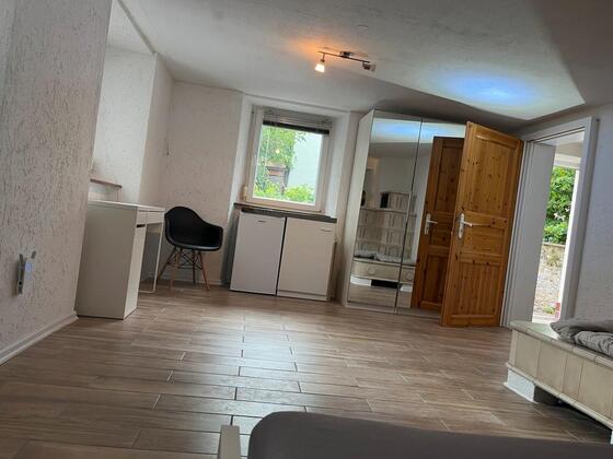 Das Zimmer ist möbliert und hat eine eigene Pantry Küche mit eigenem Kühlschrank.