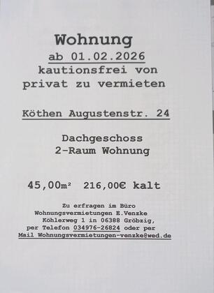 Mehr zum Angebot Wohnung 2-Raum DG 45m2 ab sofort zu vermieten: