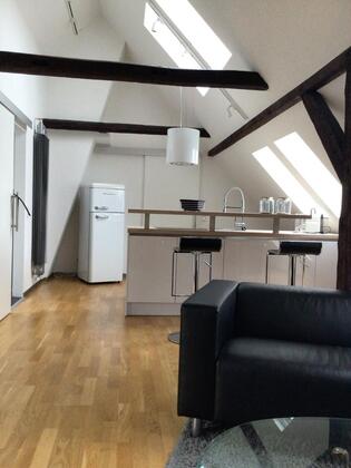 Das modern möblierte Appartment (über 2Etagen) befindet sich in einem 5-Familienhaus. Das Dachgeschoss, indem sich der Hauptteil befindet, wurde neu ausgebaut und ist mit einem offenen Wohn-/Küchenbereich hell und großzügig...