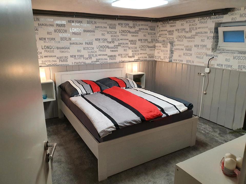 Modernes Zimmer im Keller mit 14 Quadratmetern, ausgestattet mit LED-TV, einem komfortablen Bett (1,60 x 2 m), Regal, Stuhl, Tisch und Ablagen. Der Teppichboden sorgt für Gemütlichkeit. Ein...