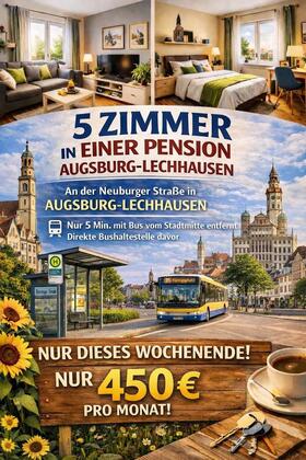 5 ZIMMER IN AUGSBURG – TOP LAGE BEI AUGSBURG Perfekt für ALLE:u2642ufe0f Monteure | Studenten | Amazon-Mitarbeiter | Pendler | junge Leute & Berufstätige Location-Vorteil:u2642ufe0f nur ca. 10 Min. zum Bahnhof Augsburg. u2728...