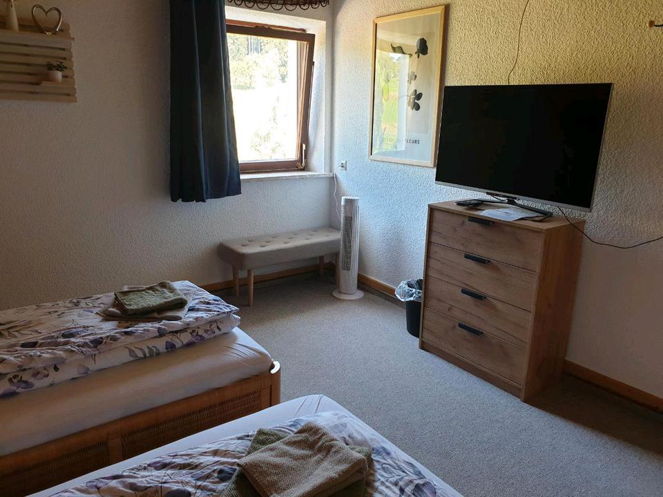 Aktuell ist das Zimmer mit 2 Betten ausgestattet, TV und kleiner Kommode.